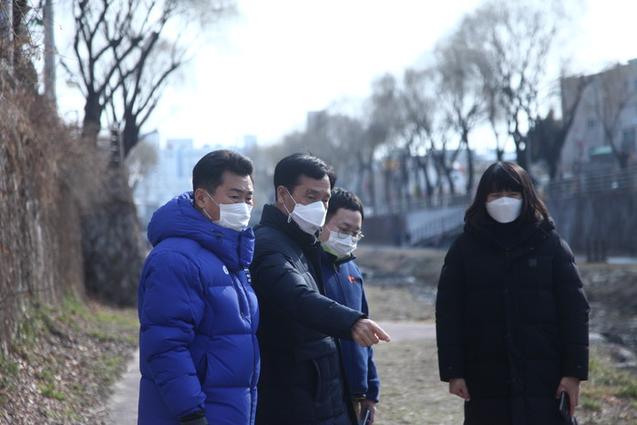 경기 수원시 팔달구는 4일 하천출입 차단시설 등 전반적인 수원천 시설물에 대해 현장 점검을 실시했다. 지난 1월에 준공된 하천출입 차단시설은 여름철 국지성 집중호우로 하천 수위 상승시 산책로 침수 위험에 신속히 대처하기 위해 수원천 일대(화홍문~세천교) 진입로 33곳에 설치했다. 사진은 권찬호 구청장(왼쪽 두 번째)이 관계자들과 현장을 살펴보고 있는 모습. (사진제공=팔달구청)