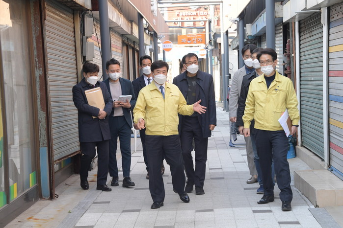 최용덕 경기 동두천시장이 14일 '생연동 원도심 상권진흥구역 지정·지원사업'을 추진하고 있는 시 상권진흥센터를 방문했다. 이날 최 시장은 상권 대표들과 정담회를 열고 추진사업에 대한 의견을 나눈 후 양키시장, 제일시장 순으로 구역내 세부 상권들을 둘러봤다. 사진은 정담회 후 최 시장(앞줄 가운데)이 상권 대표들과 상권 현장을 둘러보는 모습. (사진제공=동두천시청)
