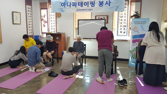 최근 서울 도봉구 방학2동 주민센터에 동성제약(주) 임직원으로 구성된 ‘아나파테이핑 봉사단’이 방문해 저소득 노인 30명이 참석한 가운데 아픈 부위에 직접 근육테이핑을 해주는 '아나파테이핑 봉사'를 했다. 사진은 테이핑을 하는 모습. (사진제공=도봉구청)