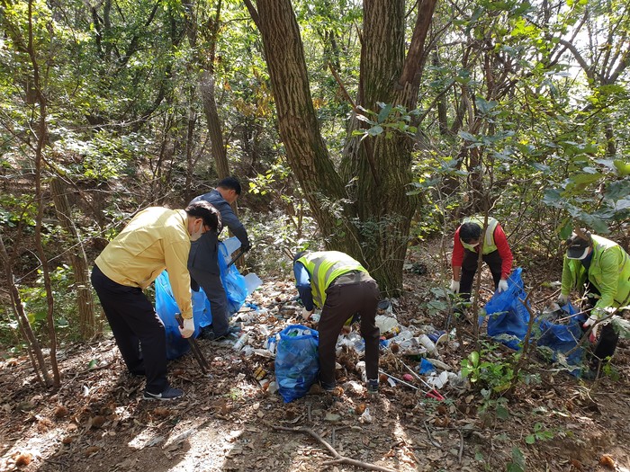 경기 남양주시 진건퇴계원행정복지센터는 지난 5일 추석연휴 기간 공동묘지 주변에 버려진 성묘 쓰레기를 수거하는 활동을 전개했다. 사진은 이날 참여자들이 성묘객들이 버린 쓰레기를 수거하고 있는 모습. (사진제공=남양주시청)