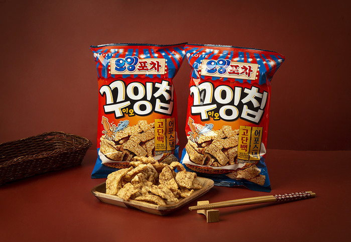 롯데제과에 따르면 ‘오잉포차 꾸이오잉칩’은 동물성 단백질에 비해 지방 함량이 적어 상대적으로 부담없이 먹을 수 있는 식물성 단백질을 사용, 한 봉지당(100g 기준) 달걀 2개 분량인 12g의 단백질이 함유된 스낵이다.