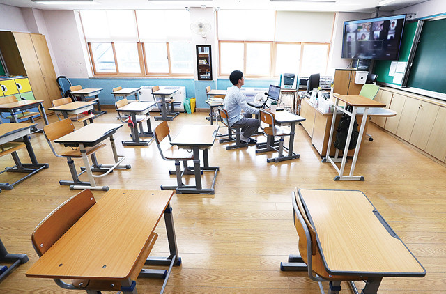 신종 코로나바이러스 감염증(코로나19) 확산세가 이어지고 있는 19일 오전 경기 용인시 한터초등학교에서 교사가 온라인 수업을 진행하고 있다.