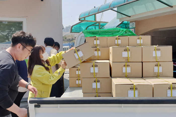 충남 서산시가 최근 코로나19 대응을 위해 사회복지시설에 손 소독제 5900개와 마스크 2만380개를 추가 지원했다. 물품은 지역내 경로당 등 9개 분야·590개 시설의 종사자와 이용자 1544명에게 배부된다. 사진은 물품을 싣고 있는 시 직원들의 모습. (사진제공=서산시청)