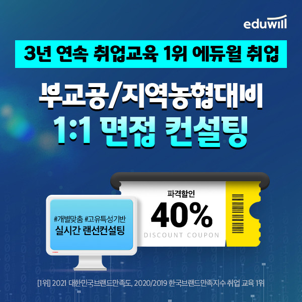 ‘1:1 랜선 취업 과외’는 현재 기간 한정 할인 이벤트도 진행하고 있으며, 선착순으로 예약을 마감할 예정이다. 취업 과외 수강생에겐 에듀윌 ‘취업 패키지’ 30% 할인 쿠폰도 특별히 제공한다.