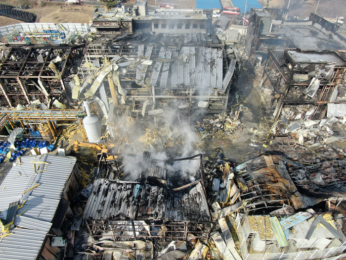 18일 오전 화재가 발생한 충남 논산시 노성면 한 전자부품 제조공장에서 소방당국이 잔불 진화 및 인명수색을 하고 있다. 이 화재로 공장 직원과 소방관 등 총 8명이 다쳐 병원에서 치료를 받고 있다.