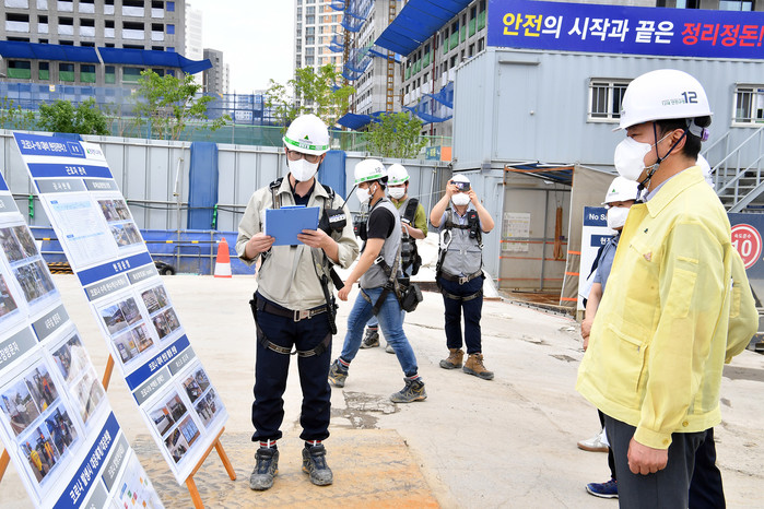 김상호 경기 하남시장은 지난 15일 감일지역내 지식산업센터와 아파트 건설현장 등 대형 건설현장의 현장 출입관리 시스템 시연 및 흡연장 거리두기 지침 실태 등 코로나19 방역수칙 준수 여부 등 현장을 점검했다. 사진은 김 시장(오른쪽)이 현장에서 관계자로부터 현황 보고를 받고 있는 모습. (사진제공=하남시청)
