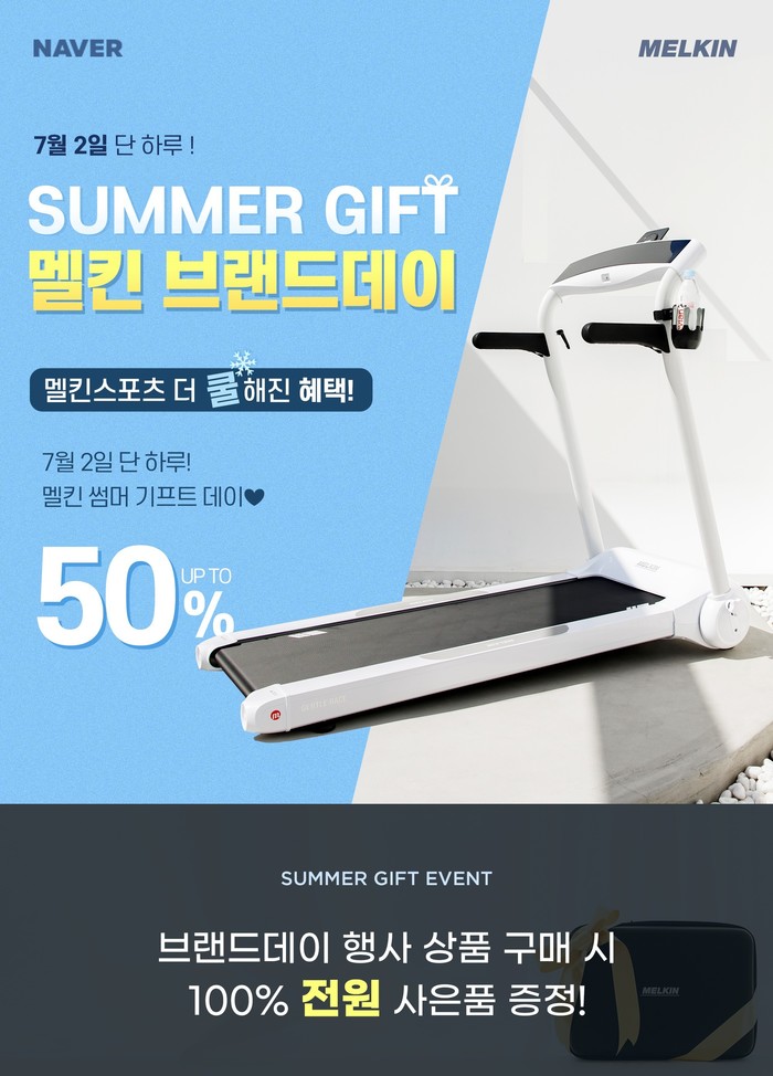 썸머기프트 멜킨 브랜드데이에 제공되는 혜택은 ▲신규고객 및 재구매고객 2천원 쿠폰 지급 ▲이벤트 상품 구매고객 매일 30명 추첨 5천원 자사 쿠폰지급 ▲젠틀레이스, 스핀바이크, 폴민바이크, 치닝디핑 구매시 그랜드 헬스기구매트 증정 ▲무게조절덤벨, 스텝퍼 구매시 레귤러 헬스매트 증정▲마사지건, 요가매트 구매시 TPE마사지볼 증정 ▲이벤트 상품 구매고객 한정 랜덤 추첨 10명 스마트 체중계 증정 등이다.