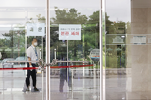 국회 출입 기자의 신종 코로나바이러스 감염증(코로나19) 확진 판정으로 27일 오전 국회 본관이 폐쇄돼 출입구가 굳게 잠겨 있다.