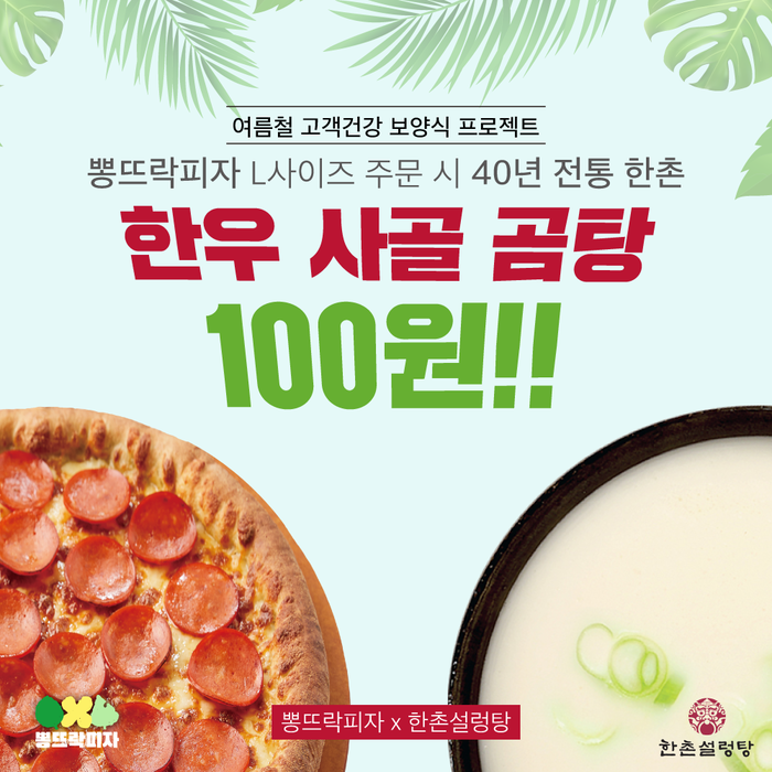 [시민일보 = 이승준] 30년 전통의 피자 브랜드 뽕뜨락피자가 40년 역사를 자랑하는 한촌설렁탕과 손잡고 업계 최초로 여름 보양식 콜라보 이벤트를 진행한다.