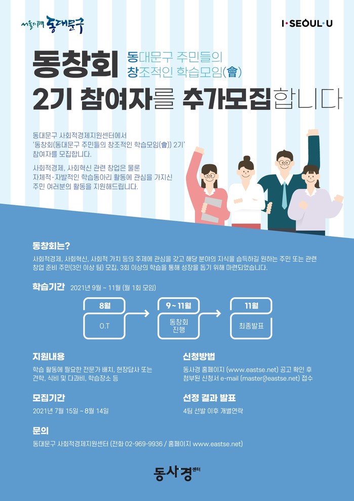 [시민일보 = 이대우 기자] 서울 동대문구(구청장 유덕열) 사회적경제지원센터(이하 동사경센터)는 사회적 경제 분야에 관심 있는 주민들을 지원하기 위한 학습모임 참여자를 모집한다.