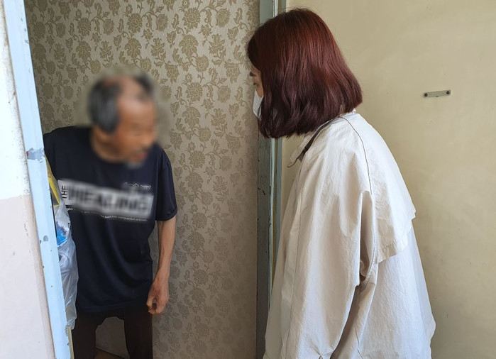 | ▲ 지난 6월 마포구 복지담당직원이 지역 내 중장년 1인가구를 방문해 실태조사를 하고 있는 모습. (사진제공=마포구청) |