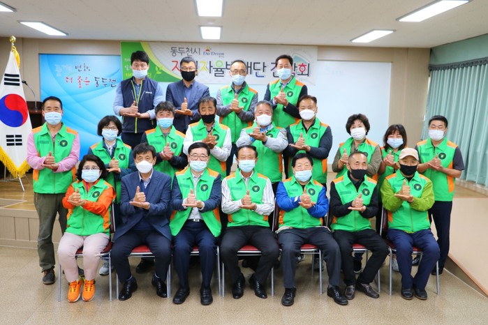 경기 동두천시 지역자율방재단이 최근 코로나19 극복을 위해 힘쓰고 있는 의료진과 관계자들을 응원하기 위한 '덕분에 챌린지' 캠페인에 동참했다. 사진은 단원들이 존경과 자부심을 의미하는 엄지손가락을 치켜든 수어 동작을 하며 감사 메시지를 전하는 모습. (사진제공=동두천시청)