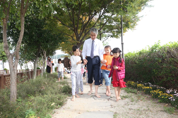 이날 박종훈 교육감은 원아들과 손잡고 맨발 걷기, 축구・사방치기 등 오감만족 놀이 교육활동에 직접 참여하며 놀이중심 유아 교육과정을 체험하였다.