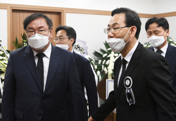 제21대 국회 여야 신임 원내사령탑 간 첫 상견례가 미래통합당 주호영 원내대표 부친상 빈소에서 이뤄졌다. 9일 오전 부친상을 당한 주 원내대표는 이날 오후 5시 20분께 빈소인 대구 경북대학교병원 장례식장에서 더불어민주당 김태년 원내대표와 처음으로 회동했다. 김 원내대표가 건넨 짧은 위로에 주 원내대표는 고개 숙이며 감사 인사를 전했다. 사진은 빈소에서 얘기 나누며 자리를 옮기는 여야 김 원내대표와 주 원내대표 모습.