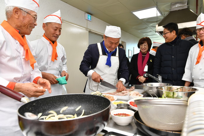 경기 양평군이 최근 군 종합사회복지관에서 남성노인 20명과 가족을 초빙해 만성질환 예방을 위한 식생활 건강 개선 및 자립 지원을 위한 요리교실 '요리하는 청춘'을 마무리하는 콘테스트를 개최했다. 사진은 정동균 군수가(가운데) 행사에 참여하는 모습. (사진제공=양평군청)