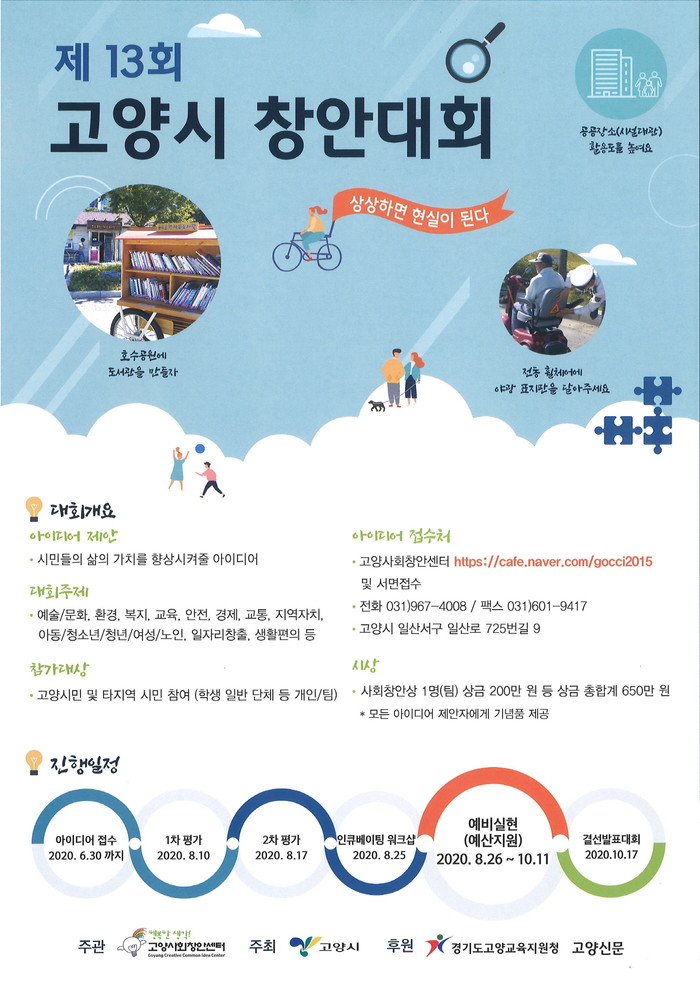 고양시가 주최하고 고양사회창안센터(대표 심욱섭)가 주관하는 이번 공모전은 경제 ‧ 문화 ‧ 복지 ‧ 안전 등 여러 분야에 걸친 자유 주제로 실시되며, 평소 일상생활에서 느꼈던 문제에 대한 창의적인 개선 방안이나 살기 좋은 지역사회 만들기에 꼭 필요한 제도 등 시정 전반에 대한 아이디어를 접수한다.