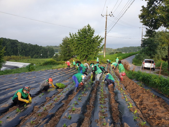 경기 여주시 새마을회가 최근 새마을지도자 40여명이 참여한 가운데 대신면 천남리 농지에 매년 개최하는 '사랑의 김장나누기 행사'를 위한 배추 모종 3000여포기를 심었다. 이날 심은 배추는 오는 11월 수확해 김장을 담가 지역내 홀몸노인 등 소외된 이웃에 전달된다. 사진은 배추모종을 심고 있는 모습. (사진제공=여주시청)
