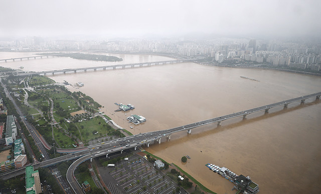 수도권 전 구간에 호우경보가 발효된 3일 오전 서울 영등포구 63스퀘어에서 바라본 한강에 누런 황토물이 흐르고 있다.