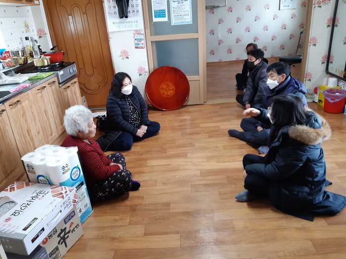 인천 강화군 교동면은 14일 교동면 지역사회보장협의체와 함께 최근 교동면 삼선리에 화재로 주택이 전소된 홀몸노인 가구를 방문해 긴급 생활용품(20만원 상당)을 전달했다. 사진은 이날 협의체 의원들이 화재 피해 가구를 방문해 대화를 나누고 있는 모습. (사진제공=강화군청)
