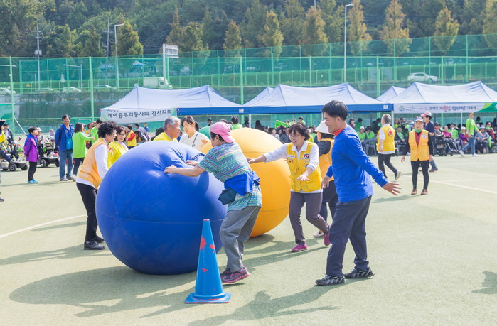 서울 강서구는 22일 가양레포츠센터에서 지역내 11개 장애인단체 회원 등 1500여명이 참여한 가운데 ‘제17회 장애인어울림한마당’ 행사를 개최했다. 이날 장애인과 비장애인들은 함께 어울려 행사를 즐겼다. 사진은 공 굴리기를 하는 모습. (사진제공=강서구청)