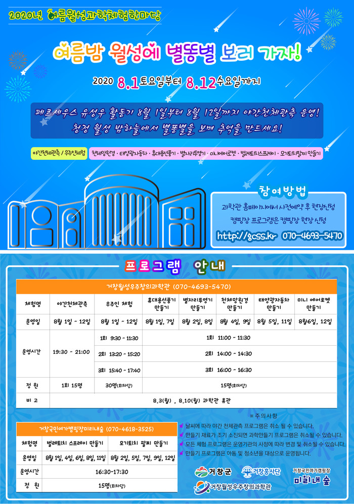 주간 프로그램으로 다양한 과학만들기 체험과 우주인 체험을 할 수 있으며, 야간 프로그램으로는 별자리 교육과 밤하늘 별들을 직접 보고 천체망원경으로 하늘의 별들을 관측할 수 있게 구성했다.