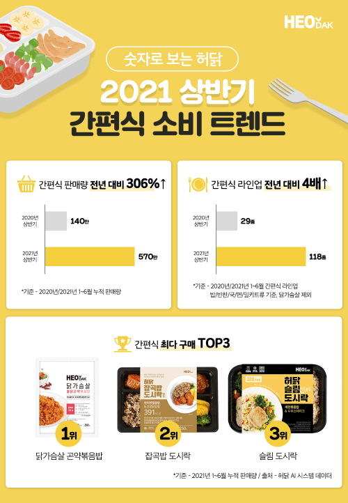 허닭은 올해 상반기 가정간편식 누적 판매량이 570만 개를 돌파했다고 30일 밝혔다. 이는 밥, 반찬, 국, 면, 밀키트류 기준으로 집계한 것으로 지난해 같은 기간 대비 306% 상승한 수치다.