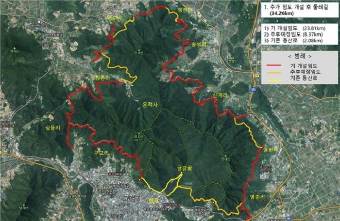 둘레길은 금강산, 만대산 일대 기존임도와 등산로 등 25.89km를 연결하고, 미 개설 구간에는 신설임도 8.37km가 조성된다.