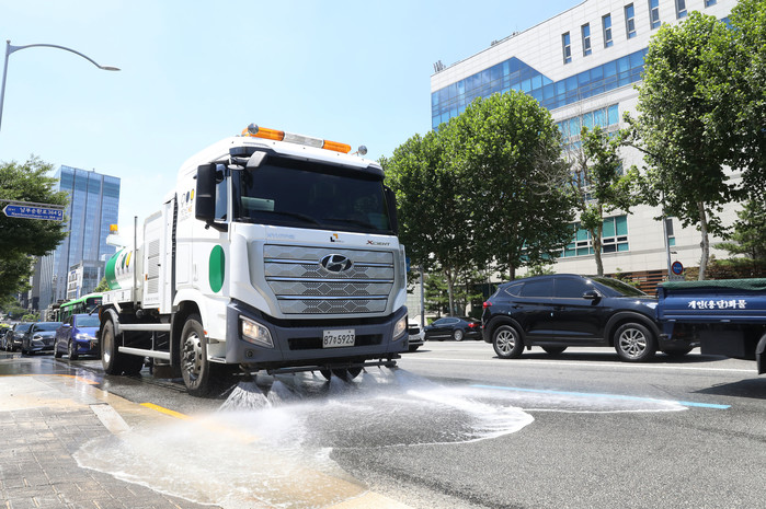 서울 강남구가 연일 기록적인 더위로 인한 폭염경보에 대처하기 위해 살수차량 23대를 총 동원해, 폭염특보 기간 중 하루 1100톤의 물을 도로 730km 구간에 뿌리고 있다. 사진은 27일 도로에 물을 뿌리고 있는 살수차의 모습 .(사진제공=강남구청)