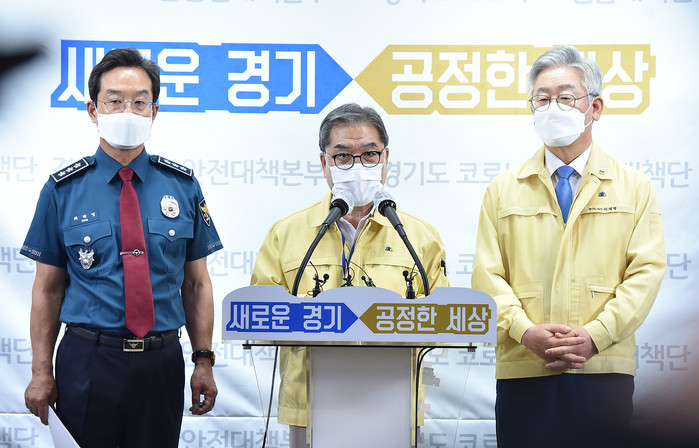 경기도교육청은 18일 경기도청에서 수도권 중심 코로나19 재확산 및 대유행 방지 공동 대응을 위해 경기도청·경기남부지방경찰청과 합동 기자회견을 열었다. 사진은 이재정 교육감(가운데)이 이재명 경기도지사(오른쪽), 최해영 경기남부지방경찰청장과 합동 기자회견을 하고 있는 모습. (사진제공=경기도교육청)