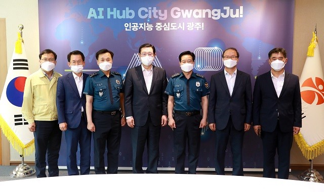 [광주=정찬남 기자] 이용섭 광주광역시장(좌측부터 4번)이 31일 오전 김창룡 경찰청장(5번)을 접견하고 자치경찰제 조기 정착 등 상호 관심사에 대한 의견을 나눈 후 관계자들과 기념촬영을 하고 있다.