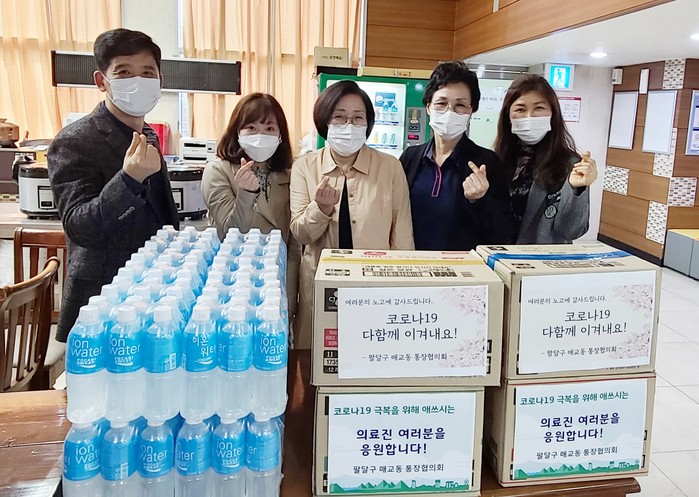 경기 수원시 팔달구 매교동 통장협의회는 16일 코로나19 현장에서 애쓰고 있는 의료진과 관계 공무원들을 격려하기 위한 간식과 즉석식품을 전달했다. 이날 통장협의회 임원진들은 팔달구보건소에 방문해 코로나19 비상대책반에 간식을 전하고, 경기도의료원 수원병원 코로나19 의료진이 숙박시설로 이용 중인 수원호스텔에는 즉석 식품을 지원했다. 사진은 관계자들이 기념촬영을 하는 모습.(사진제공=팔달구청)
