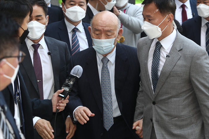 전두환 전 대통령이 27일 피고인으로 광주지방법원에 출석하고자 청사로 이동하면서 기자들 질문을 받고 있다. 전씨는 5.18 민주화운동 당시 헬기사격을 목격했다고 증언한 고(故) 조비오 신부를 2017년 4월 출간한 회고록에서 '성직자라는 말이 무색한 파렴치한 거짓말쟁이'라고 비난해 명예를 훼손한 혐의로 재판에 넘겨졌다.