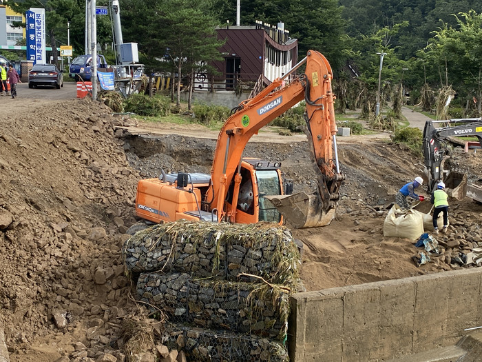 25일 오전 경북 포항시 북구 죽장면 국도31호선 입암교 주변에서 작업자들이 끊긴 연결도로를 복구하고 있다. 이곳 연결도로는 전날 태풍 '오마이스' 영향으로 많은 비가 내리면서 물에 떠내려갔다.