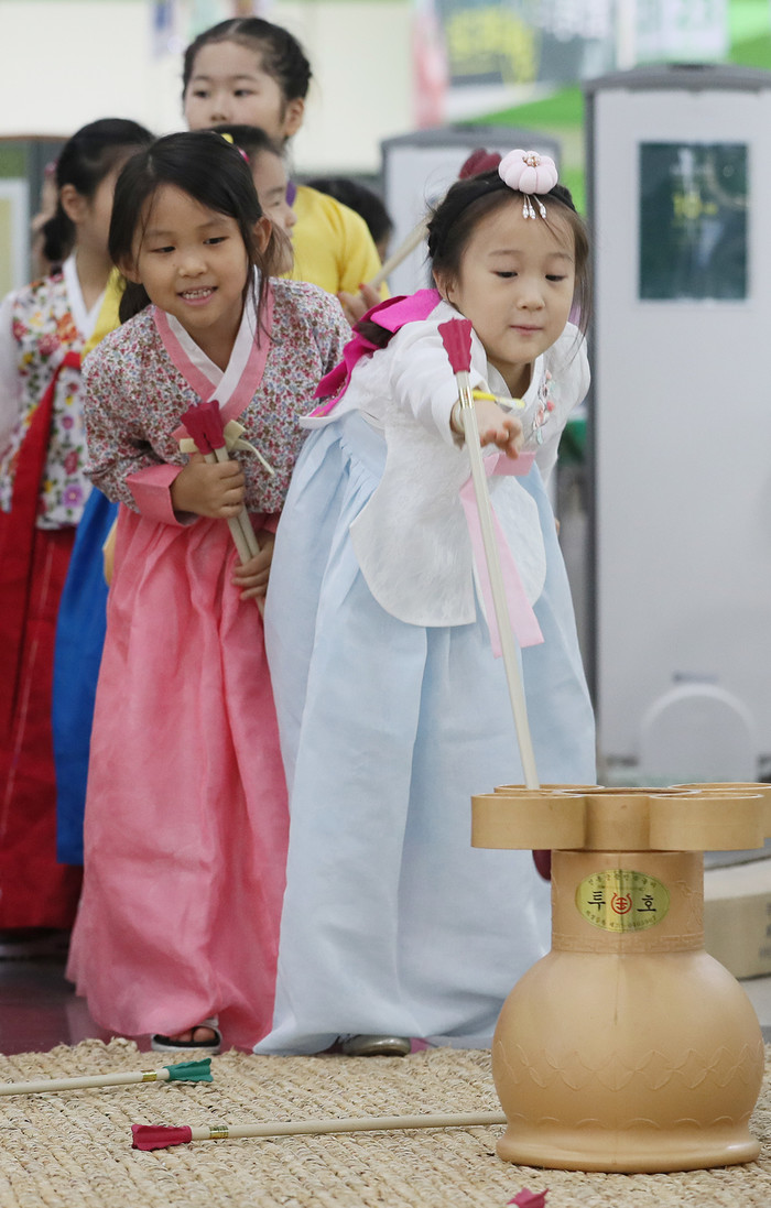 추석을 앞두고 4일 오전 서울 서초구 하나로마트 양재점에서 한복을 입은 어린이들이 투호 던지기 체험을 하고 있다.