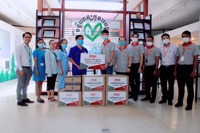 | ▲ 캄보디아 앙코르아동병원에 방역물품을 전달한 후 기념촬영을 하는 모습.(사진제공=BNK캐피탈) |