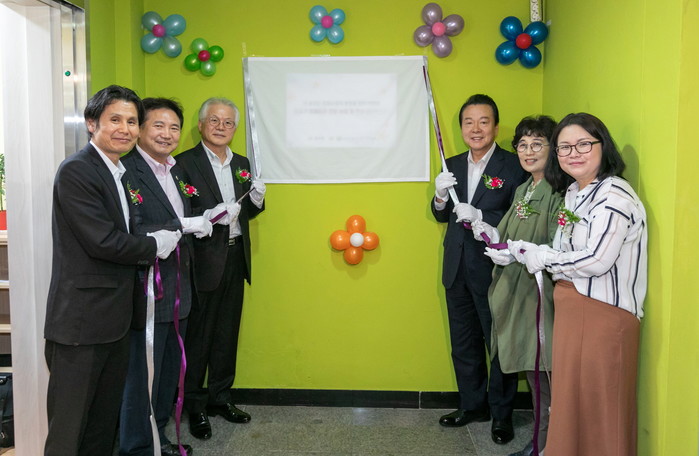 서울 강서구는 23일 강서장애아동지원센터(강서로18길 14) 지하 1층에서 ‘장애아동 전용 놀이 및 학습공간’ 개소식을 개최했다. 사진은 개소식에 참석한 노현송 구청장(오른쪽에서 세 번째)과 관계자들이 현판식을 진행하는 모습. (사진제공=강서구청)