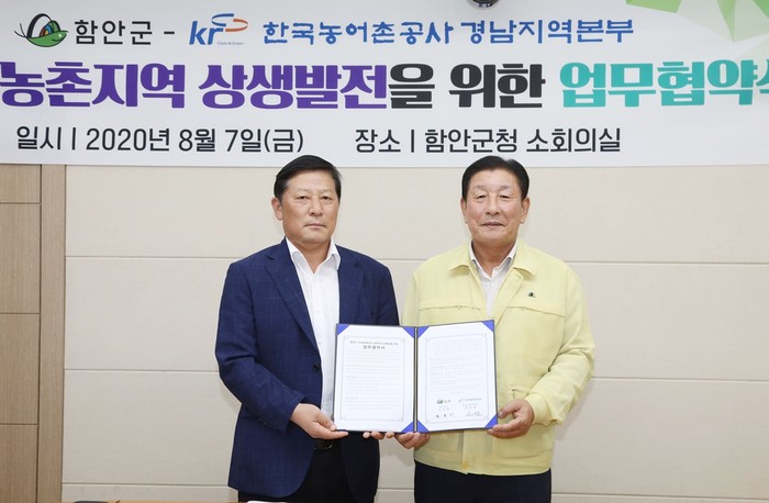 함안군은 7일 오전 11시 군청 2층 소회의실에서 한국농어촌공사 경남지역본부와 농촌지역 상생발전을 위한 업무협약을 체결했다.