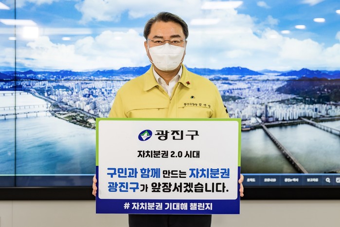 김선갑 서울 광진구청장이 지난 13일 ‘#자치분권 기대해’ 챌린지에 동참했다. 이 챌린지는 자치분권에 대한 공감대를 형성하고 소망과 염원을 공유하기 위해 대통령 소속 자치분권위원회가 시작한 캠페인이다. 사진은 김 구청장이 #자치분권 기대해 챌린지를 하고 있는 모습. (사진제공=광진구청)