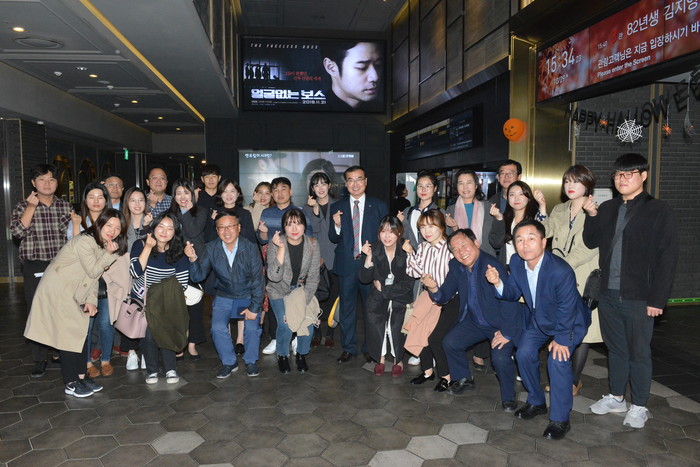 경기 수원시 영통구는 최근 격무에 지친 직원의 사기 진작 및 소통과 화합을 위한 '영통 시네마 산책'을 추진하고 광교 롯데시네마에서 함께 영화를 보며 힐링하는 시간을 보냈다. 이날 행사에는 송영완 구청장을 비롯한 영통구 8급 공직자 30여명이 참여해 <82년생 김지영>을 관람하고 저녁을 함께 먹으며 격의없이 자유롭게 소통했다. 사진은 송 구청장(가운데) 및 관계자들이 기념촬영을 하는 모습. (사진제공=영통구청)