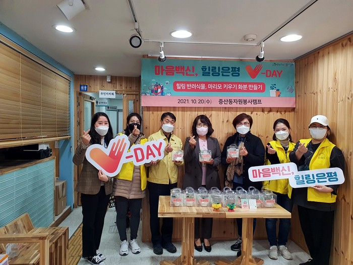 서울 은평구 증산동 주민센터가 지역 주민들의 지친 마음을 위로하기 위해 지난 20일 평생 반려식물로 인기가 있는 마리모 화분 20여개를 직접 제작해 성산지역아동센터와 바오로교실재활센터로 전달했다. 사진은 전달식에서 관계자들이 기념촬영을 하는 모습. (사진제공=은평구청)