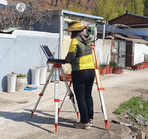 | ▲ 지적재조사사업지구에서 측량을 실시하고 있다. |