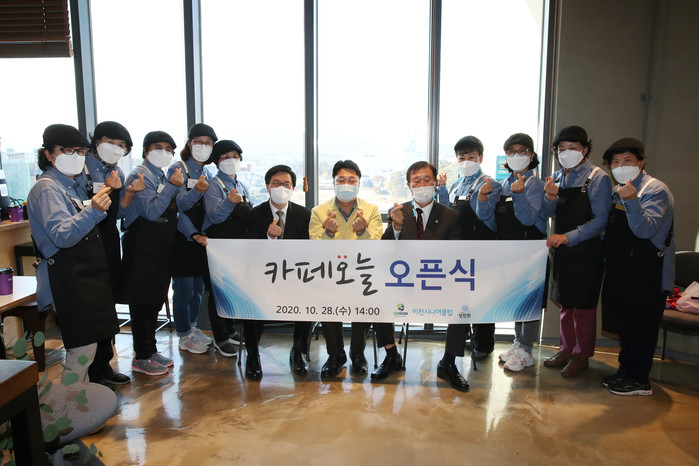 경기 이천시가 최근 시 최초 실버카페인 '카페 오늘' 오픈식을 개최했다. 카페 오늘은 이천시니어클럽에서 경기도 노인일자리 확충사업 공모 사업비 및 시로부터 사업비를 지원받아 이천시립효양도서관 4층에 설치됐다. 사진은 개소식에 참석한 엄태준 시장(가운데)과 관계자들이 기념촬영을 하고 있는 모습. (사진제공=이천시청)