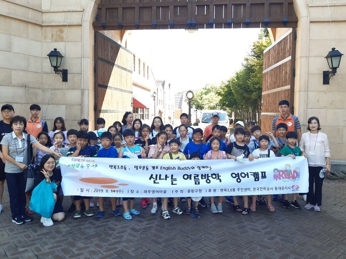 서울 중랑구는 지난 14일 여름방학을 맞아 저소득층 어린이들의 영어실력 향상을 위해 ‘파주영어마을 체험프로그램’을 운영했다. 사진은 프로그램에 참여한 학생들이 기념촬영을 하는 모습.(사진제공=중랑구청)