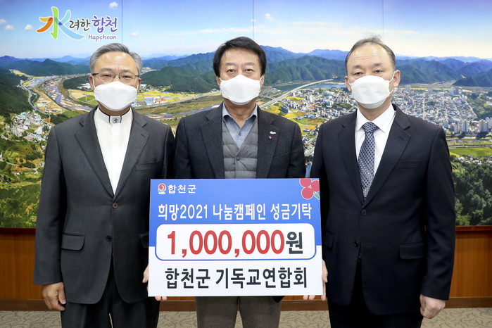 [합천=이영수 기자]합천군 기독교연합회(전 회장 류낙안)는 8일 합천군청을 방문하여 이웃돕기 성금 100만원을 기탁했다.