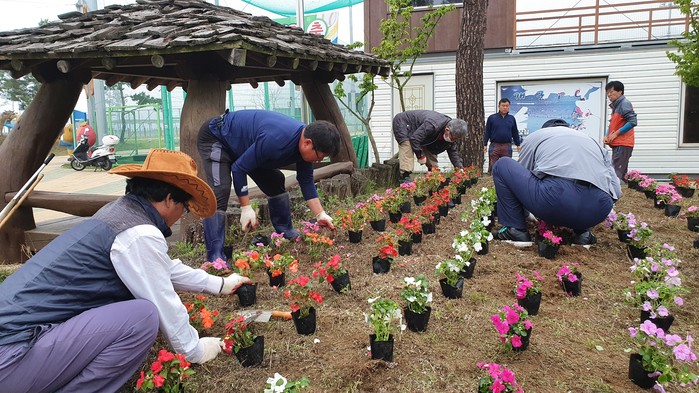 경기 양평군 개군면은 26일 이장협의회, 새마을지도자회, 주민자치회와 합동으로 개군면 레포츠공원, 시가지 입구, 복지회관 및 원형 교차로를 대상으로 메리골드, 백일홍, 페츄니아 등 8000여본을 식재하며 꽃길을 조성했다. 사진은 꽃을 식재하고 있는 모습. (사진제공=양평군청)