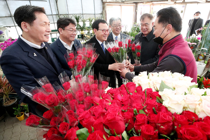 인천시의회가 최근 남동구 지역 화원을 직접 방문, 코로나19 확산으로 어려움을 겪고 있는 화훼산업 현황과 꽃소비 진작 방안에 대해 업계 종사자 의견을 경청하고, 의회사무처 전직원에게 장미꽃 한 송이씩 나눠주며, 화훼소비 촉진 홍보 캠페인을 전개했다. 사진은 한 화훼농가를 방문한 이용범 의장(왼쪽 세 번째)이 장미꽃을 구매하고 있는 모습. (사진제공=인천시의회)