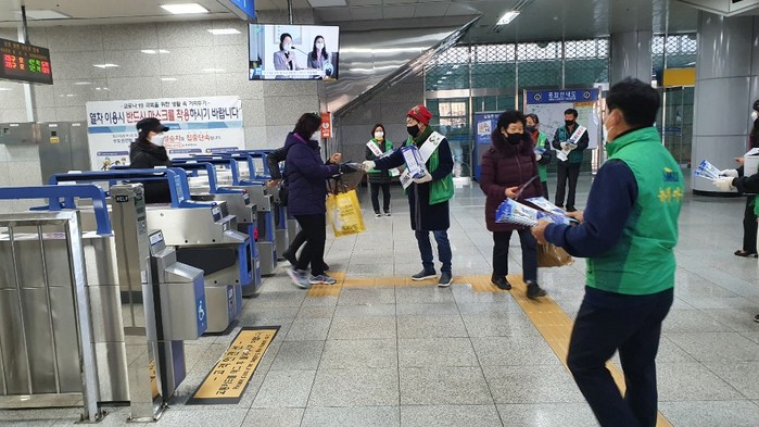 경기 양주시 회천2동 새마을지도자회와 새마을부녀회는 9일 덕계역에서 코로나19 지역내 확산을 방지하기 위해 시민들에게 마스크 착용을 독려하는 ‘마스크 착용 캠페인’을 전개했다. 사진은 캠페인에 참여한 회원들이 시민들에게 마스크를 나눠주고 있는 모습. (사진제공=양주시청)