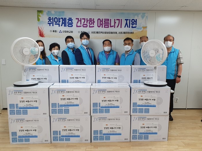 서울 서초구 서초3동 주민센터는 산정현교회 후원으로 올여름 폭염에 대비해 지역내 주거취약계층 중 선풍기가 없거나 노후돼 교체가 필요한 20여가구를 선정해 선풍기를 지원했다. 사진은 전달식에서 관계자들이 기념촬영을 하는 모습. (사진제공=서초구청)