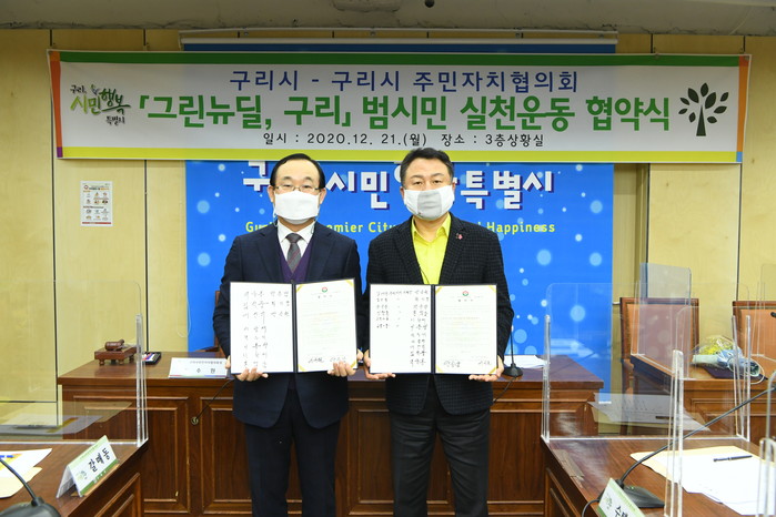 경기 구리시가 지난 21일 구리시주민자치협의회 및 구리시통장연합회와 '그린뉴딜 구리, 범시민 실천운동' 추진 협약을 체결했다. 이날 협약에 따라 기후위기 시민의식 개선에 상호 협력하며, 생활속에서 1회용품 사용 자제 등 그린뉴딜 운동을 실천하기로 했다. 사진은 안승남 시장(오른쪽)이 관계자와 기념촬영을 하는 모습. (사진제공=구리시청)
