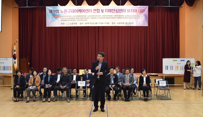 서울 노원구는 22일 구청 대강당에서 지역내 치매안심센터 노인 등이 참석한 가운데 ‘2019년 제9회 노원구 데이케어센터연합 및 치매안심센터 어르신 보치아대회’를 개최했다. 사진은 오승록 구청장이 축사를 전하고 있는 모습. (사진제공=노원구청)